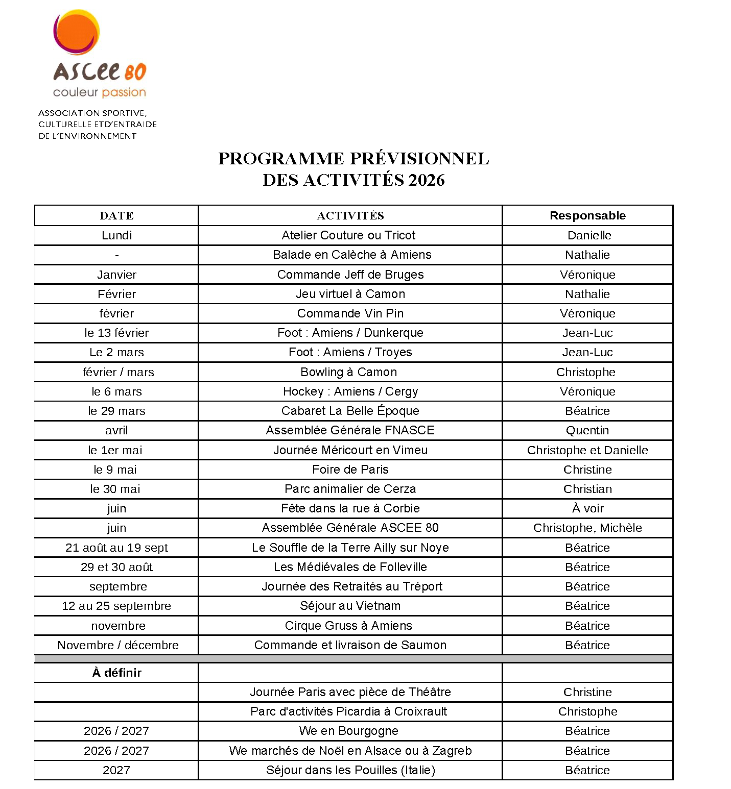 Programme prévisionnel des activités 2026