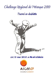 Le déroulement du challenge régional est modifié. Le tournoi est réduit à la journée du samedi 15 mai 2010 et aura lieu sur les terrains du Club de Pétanque de Mundolsheim. Repas sur place à midi sous forme de barbecue.