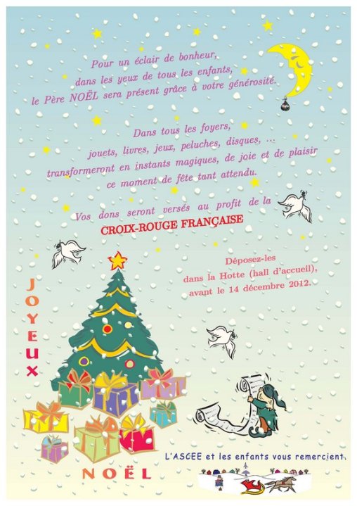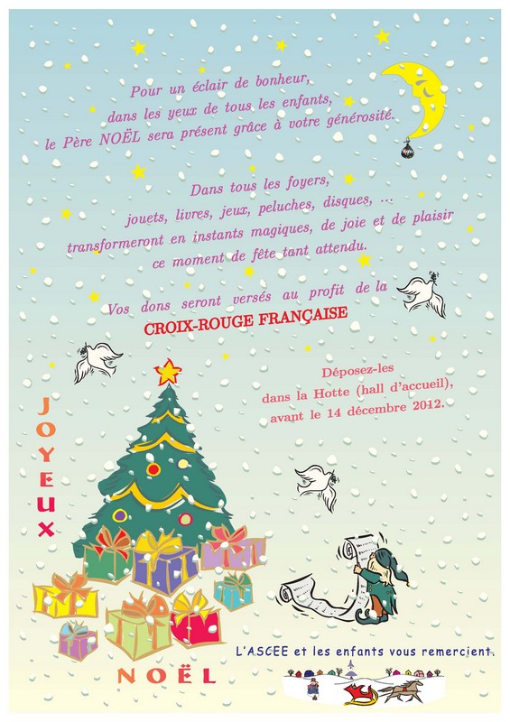 du 21 novembre au 14 décembre 2012 : collecte de jouets publié le 23 novembre 2012 imprimer partager L’ASCEE 63 organise une collecte de jouets au profit de la Croix Rouge. Vous pouvez les déposer dans le hall de la DDT63/DREAL jusqu’au 14 décembre 2012. L’ASCEE et les enfants vous remercient. imprimer partager Haut de page