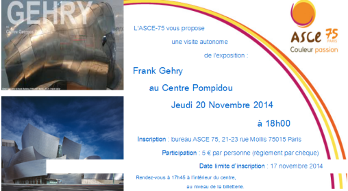 Exposition Franck Gehry au centre Pompidou publié le 3 décembre 2014 imprimer partager Le 20 novembre, l’ASCE-75 vous propose une visite autonome imprimer partager Haut de page