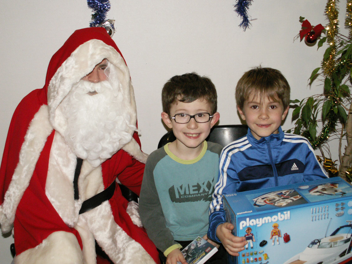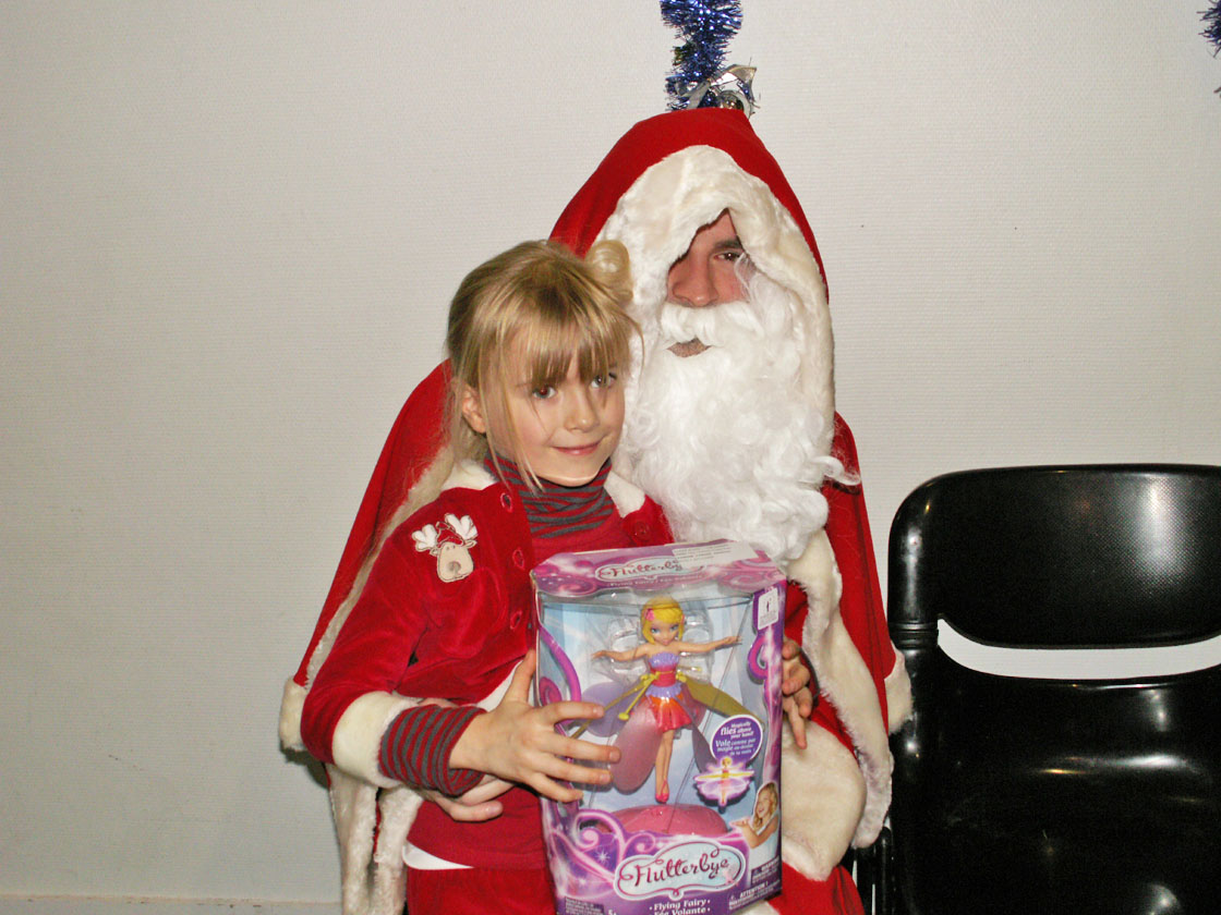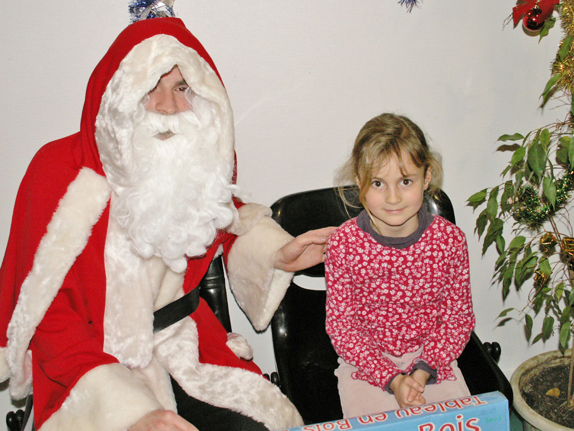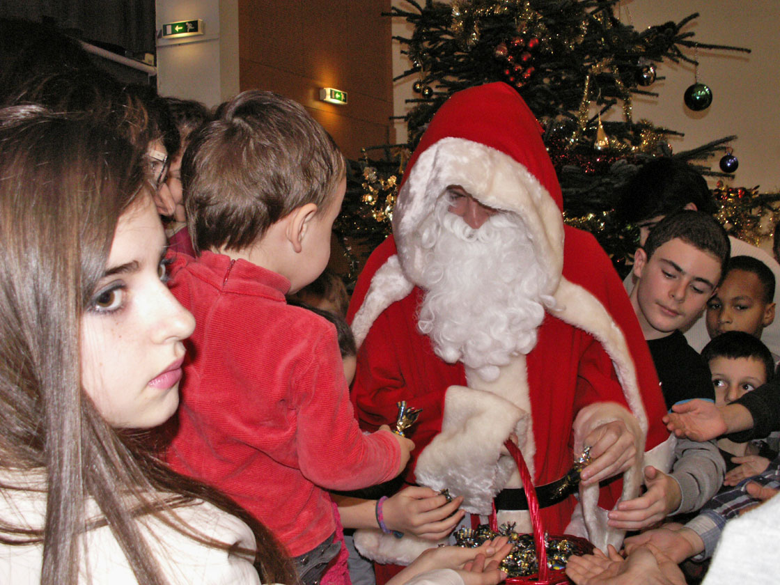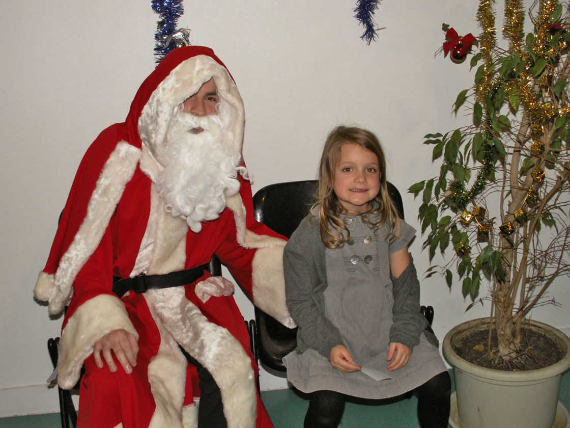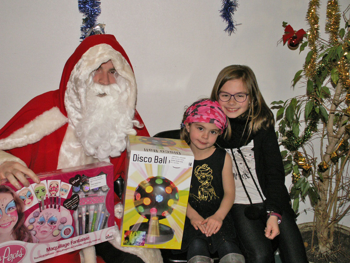 Enfin après avoir tiré la tombola des programmes et gâté quelques chanceux ou chanceuses, le Père Noël tant attendu a fait son entrée sur scène et s’est bien vite retrouvé encerclé par tous les bambins curieux de le voir de près et par les plus grands attirés par la corbeille de papillotes avec les pétards. Bien sûr la hotte du Père Noël était bien remplie et chacun a pu repartir avec jouet et sourire…