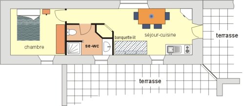 Le logement n°1 (L’Estacade) bénéficie de deux belles terrasses, mais reste petit par sa surface de 27 m2 qui peut accueillir quatre personnes maximum.