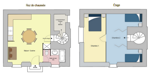 Ce logement de type 3, bénéficie d’un rez-de-chaussée dans lequel se trouvent un séjour-cuisine (avec une banquette lit de 140), la salle de bain et les toilettes, et d’un étage doté de deux chambres.