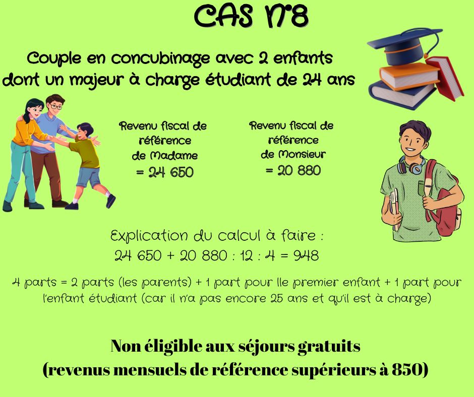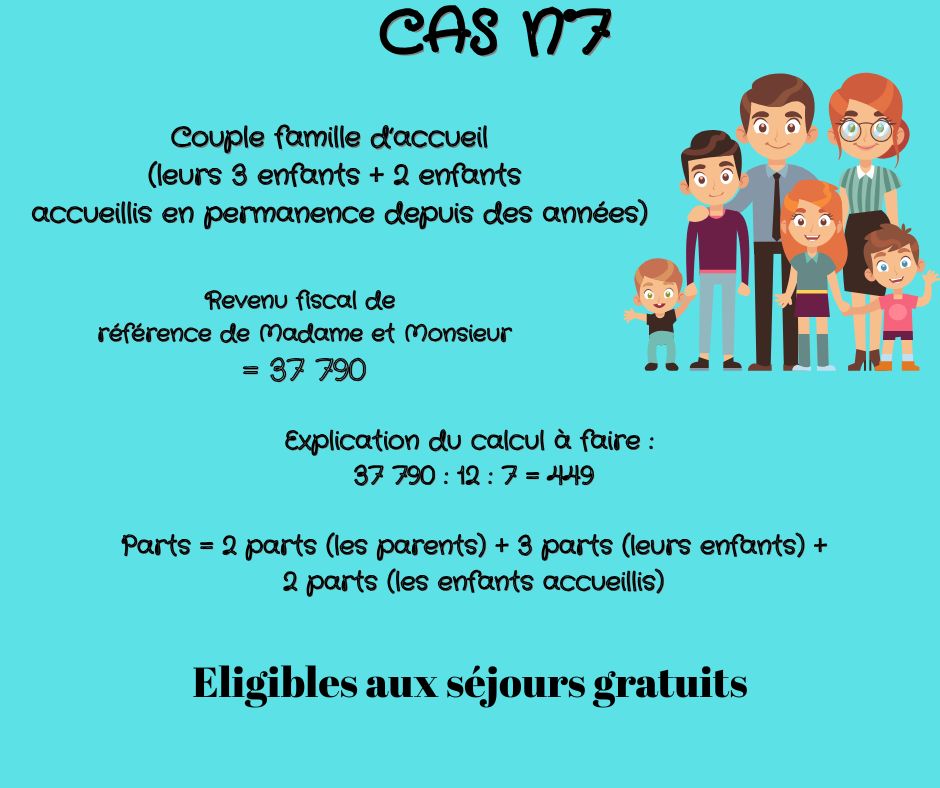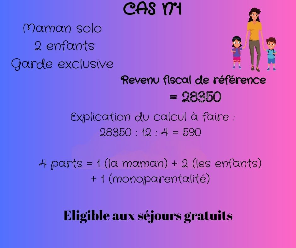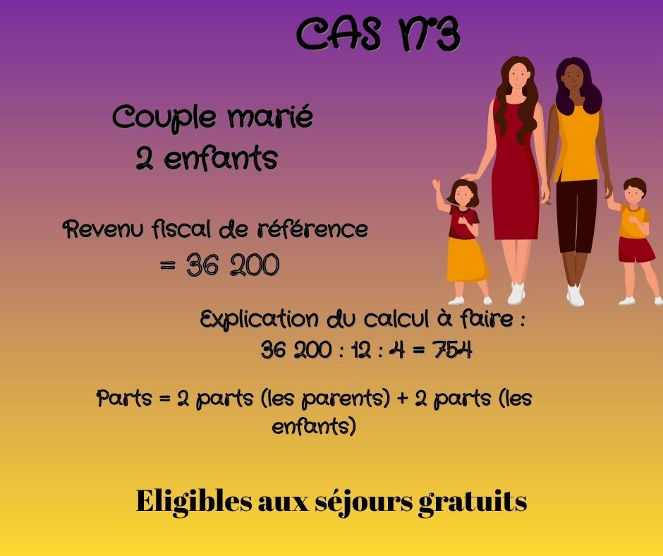 Le revenu fiscal de référence de l’avis d’imposition est le montant de base à prendre en compte pour le calcul des revenus mensuels de référence pour les séjours gratuits, il faut ensuite le diviser par 12 (mois), et diviser par le nombre de parts.