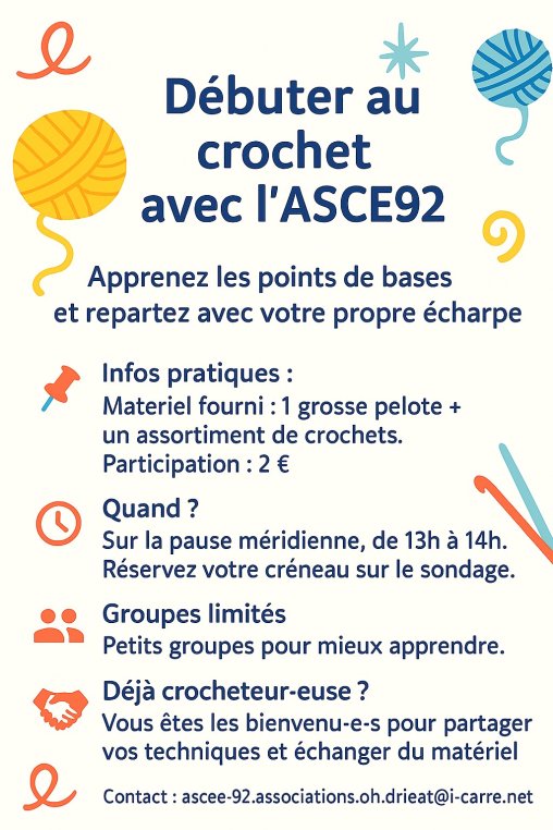 – Lancement d’un atelier "Débuter au crochet" - participation de 2€ avec des créneaux au choix sur un futur groupe whatsapp, qui est intéressé.e?