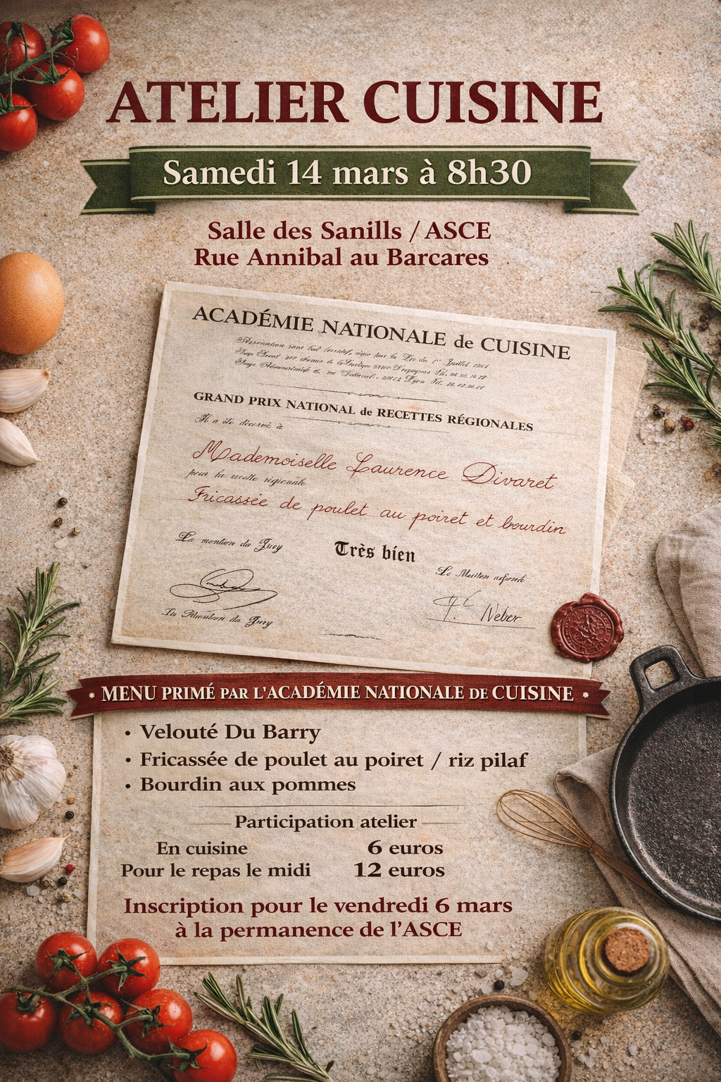 Il s’agit du menu primé par l’Académie Nationale de Cuisine, dans la catégorie "Grand prix national de recettes régionales" que Laurence GIL, notre cuisinière en cheffe, a dû concocter pour l’obtention de son diplôme, dont vous trouvez copie sur l’affiche de cette manifestation. Elle l’a obtenu haut la main avec Mention Très Bien du Jury .