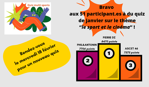 Podium et classements du 1er quiz multi sports du mercredi 28 janvier 2026 ! Merci et bravo aux 51 participants.es.