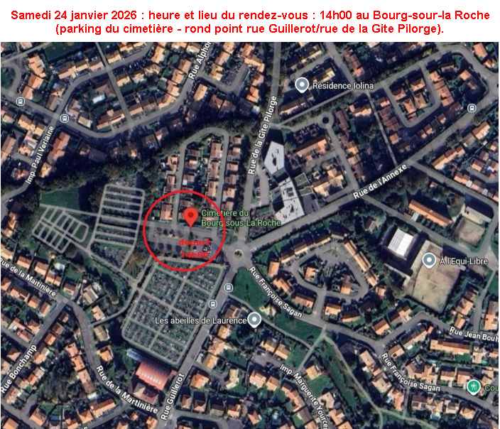Le rendez-vous est fixé à 14h00 au Bourg Sous La Roche (parking du cimetière - rond point rue Guillerot/rue de la Gite Pilorge).