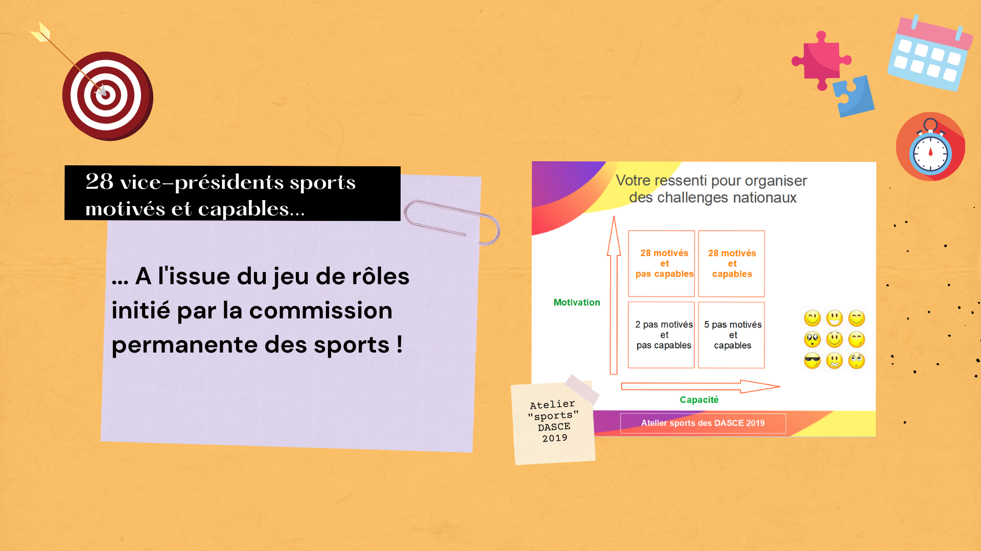 - A l’issue de l’animation des jeux de rôle pour se familiariser avec l’organisation de challenges sportifs nationaux lors de l’atelier sports des DASCE 2019, 28 vice-présidents sports se sont déclarés motivés et capables de se lancer ce défi prochainement. Bonne nouvelle pour l’avenir de notre mouvement !