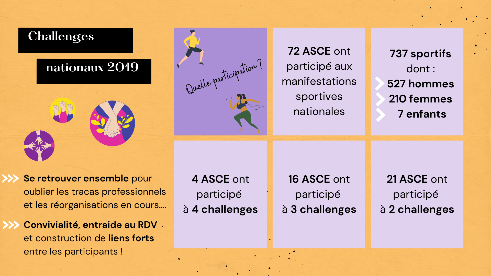 - 72 ASCE ont participé aux manifestations sportives nationales, soit un total de 737 sportifs dont 527 hommes, 210 femmes et 7 enfants. 4 ASCE ont participé à 4 challenges, 16 ASCE ont participé à 3 challenges et 21 ASCE ont participé à 2 challenges. Les ASCE et leurs « sportifs » sont heureux de se retrouver ensemble. Le temps d’un week-end, nous oublions les réorganisations administratives des services de nos ministères de tutelle. La convivialité, l’entraide souvent présentes sur les challenges, fédèrent les participants et animent la volonté des adhérents à venir sur les rencontres sportives d’année en année.