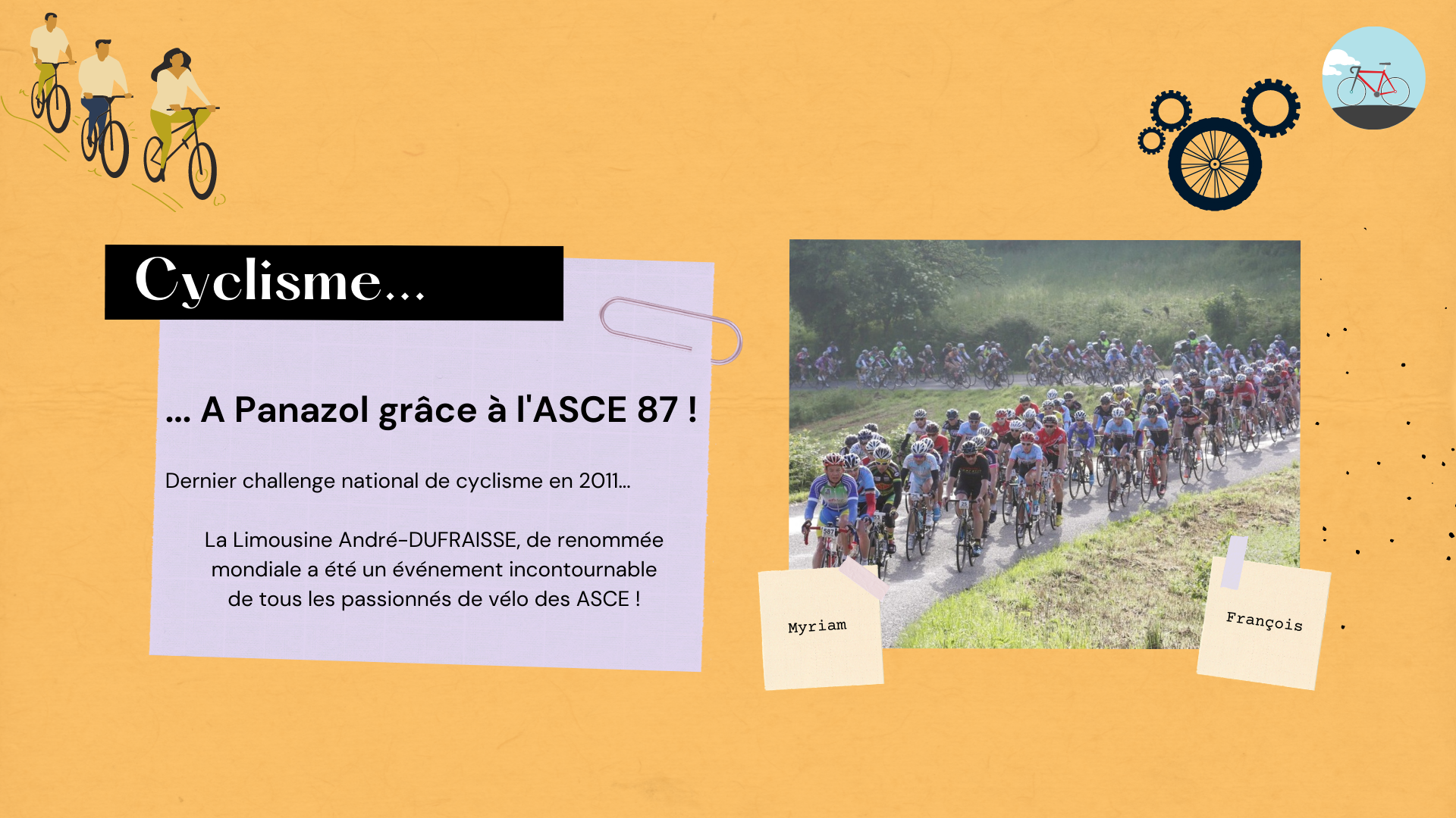 - L’année 2019 a été empreinte de renouveau sur les routes de France grâce au challenge national de cyclisme organisé brillamment par l’ASCE 87 à Panazol. Le dernier challenge de cyclisme datait de 2011. C’est avec intérêt que la FNASCE a encouragé la réussite de ce challenge en 2019 et c’est avec plaisir que l’ASCE 87 a renouvellé l’expérience en 2020 (le challenge a néanmoins été annulé à cause de la crise sanitaire). Cette cyclo-sportive, la Limousine André-DUFRAISSE, de renommée mondiale est un événement incontournable de tous les passionnés de vélo des ASCE. C’est une course prestigieuse qui a lieu entre Limoges et Vassivière sur les terres du célèbre et éternel Raymond POULIDOR.