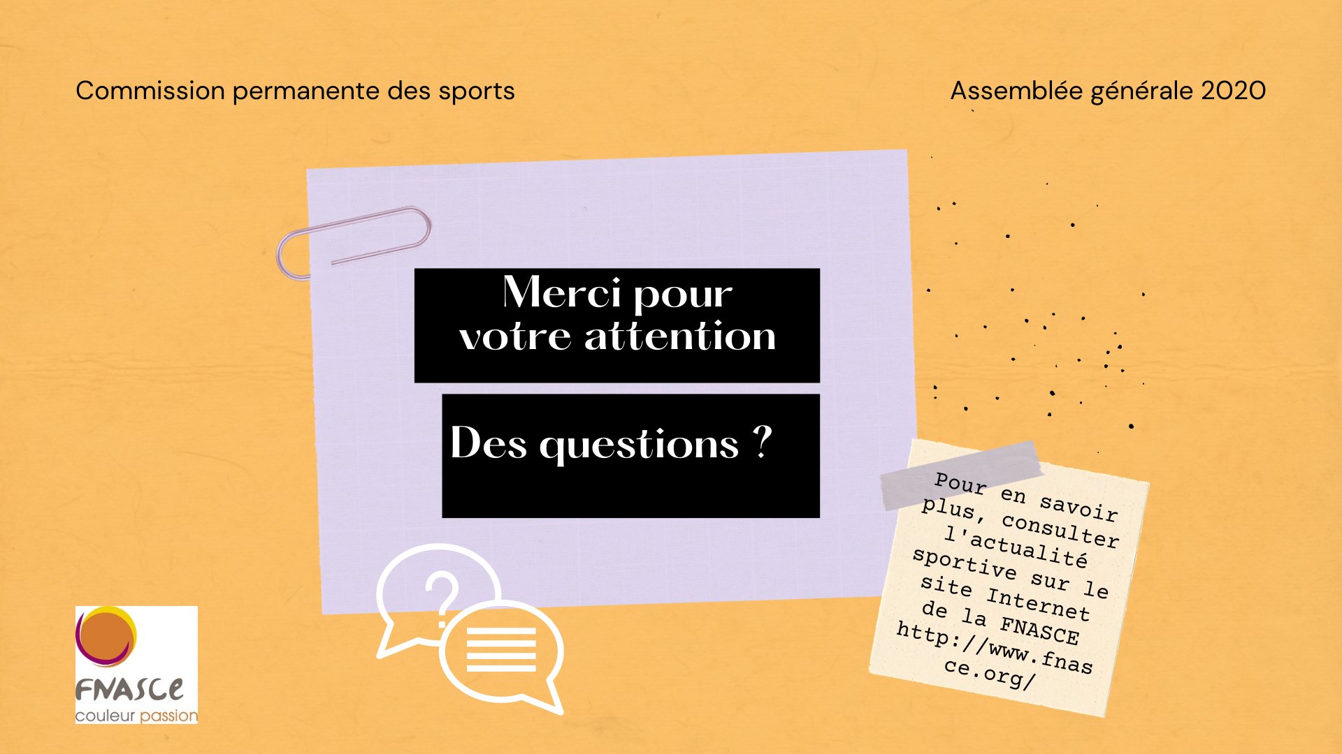 Pour cela, vous pouvez consulter le diaporama (format pdf - 15 Mio - 26/10/2020) diffusé en plénière, ainsi que les informations suivantes qui transmettent les messages principaux communiqués par les responsables sportifs de la FNASCE.