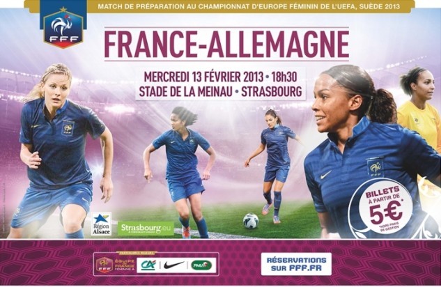 Le mercredi 13 février (18h30), la Meinau va vibrer pour les filles ! L’Equipe de France féminine, emmenée par Louisa Necib, Gaëtane Thiney ou encore Sandrine Soubeyrand sera à Strasbourg pour y disputer un match amical de très haut-niveau face à l’Allemagne, dans le cadre des préparatifs à l’Euro de juillet 2013 en Suède. Réservez dès à présent vos places pour ce match international et pour soutenir vos Bleues. L’ASCE 67 vous fait profiter de tarifs préférentiels (-25 %) :