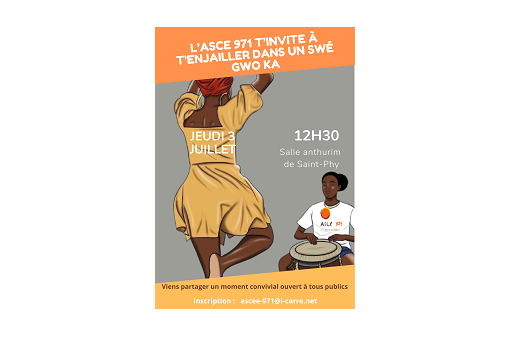 Pour débuter les vacances 2025, l’ASCE te propose de te défouler au son du Ka lors d’un Swé gwo ka le jeudi 3 juillet à 12h30 à la salle de Anthurium.
